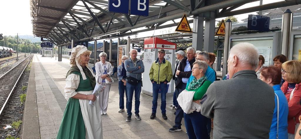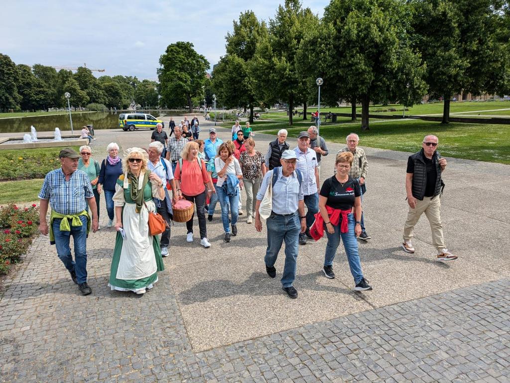 Am frühen Morgen, bei schönem Wetter, startete die 31-köpfige Reisegruppe an der Festhalle in Tennenbronn mit privaten PKW nach Rottweil. Weiter ging es mit dem Zug zum Hauptbahnhof nach Stuttgart. Im Zug verteilten die Organisatoren ein Snacksäckchen. In Stuttgart angekommen ging es zu Fuß unter der Führung der Marktfrau, Evelyn Immegart, mit Blicken auf die Baustelle „Stuttgart 21“, in die Stuttgarter Innenstadt. Über die „Pferdle & Äffle“ Ampel in die Königstraße und in die angrenzende Schlossgarten-Parkanlage, vorbei an dem Staatstheater, dem Eckensee, der Kunstmeile wie Staatsgalerie, Haus der Geschichte, Neuem Schloss zum Schlossplatz unter historischen Anekdoten der Marktfrau. Vom 4. Stock des Kunstmuseums konnte man einen Blick über die Stuttgarter Innenstadt werfen. Weiter über den Schillerplatz, vorbei am Fruchtkasten und der Stiftskirche sowie dem Alten Schloss ging es zur „Stuttgarter Markhalle“. Dort erwartete die Reisegruppe am historischen „Ceres-Brunnen“ eine Käseverkostung am Käsestand der Firma Widmann. Der Geschäftsführer erzählte einiges über diverse Käsesorten. Erstaunt erfuhr man, dass es weltweit ca. 5.000 Käsesorten gibt. Danach konnte man die kulinarische Vielfalt der Markthalle auf sich wirken lassen.